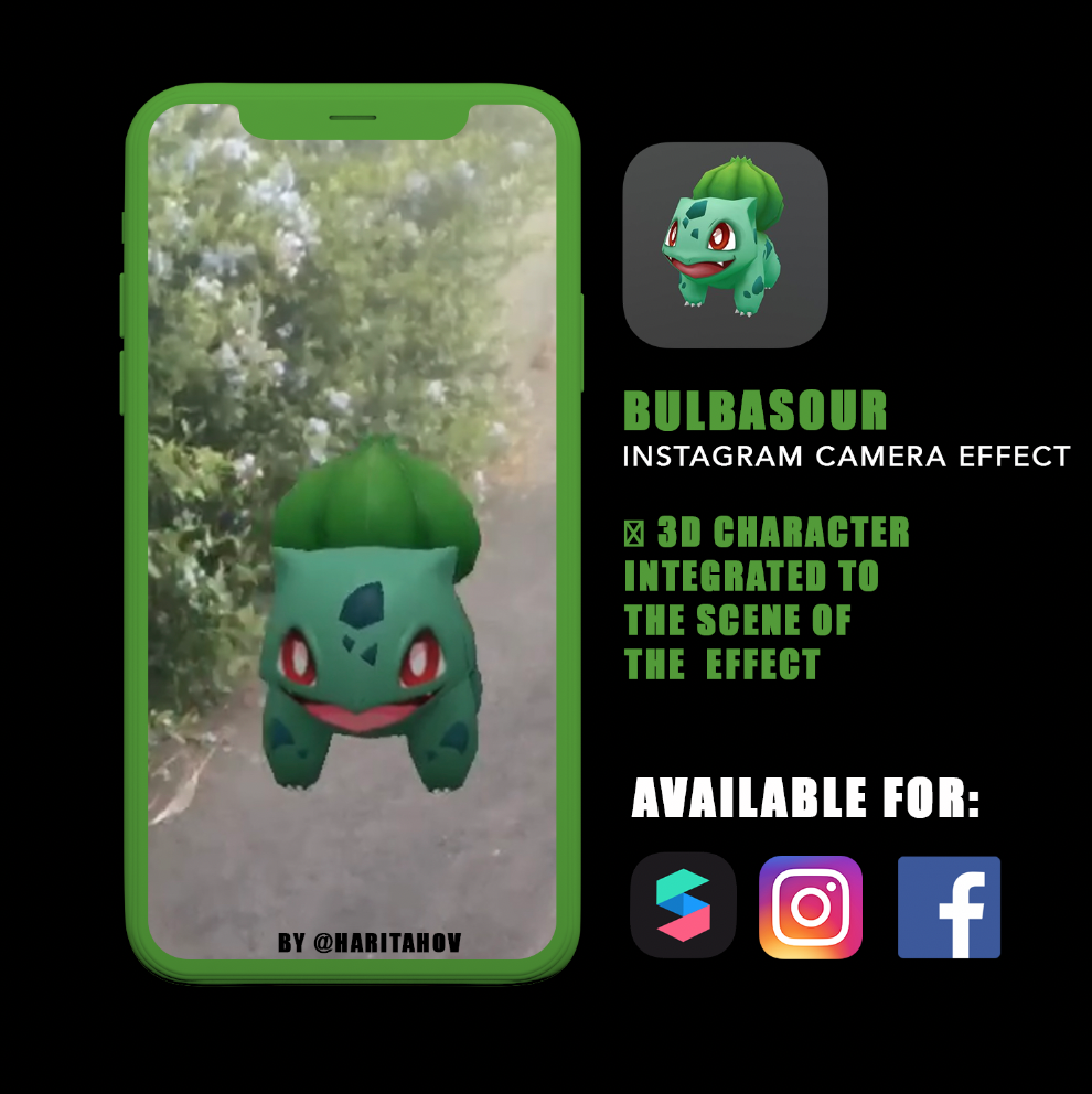 Spark AR Filter for Instagram and Facebook. The filter has 3D integrated BULBASAUR figure which you can manipulate. Make bigger or smaller with the pinch of two fingers. Place the character wherever you need using your phone camera on Instagram or Facebook.Files are ready for upload to Spark AR HUB.
